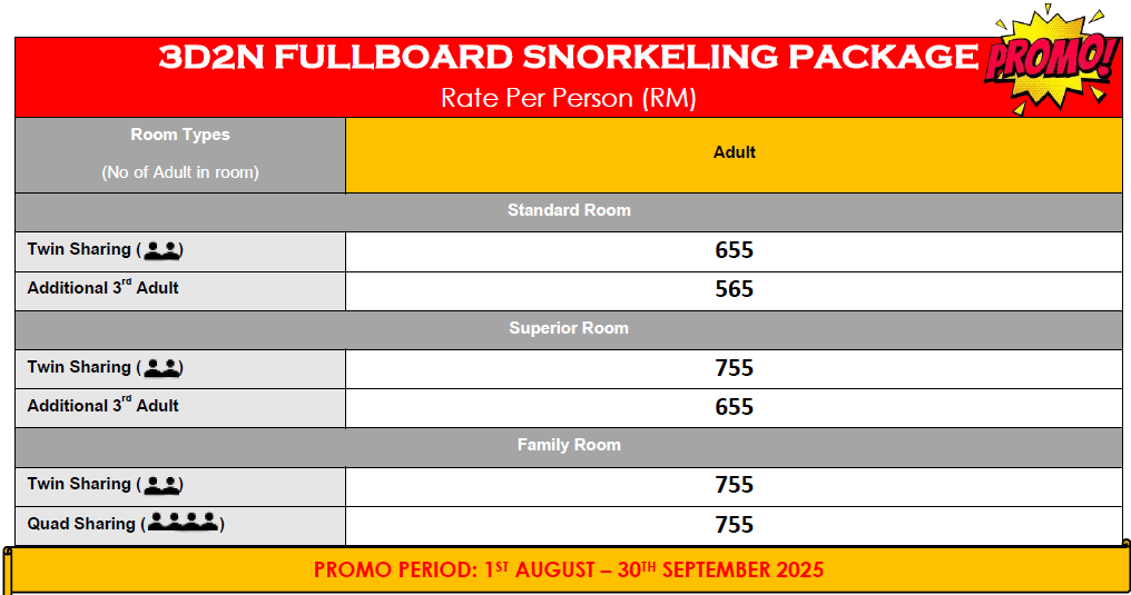 • Marine Park Fee (Pay at Jetty):-*Malaysian – RM 5/Adult & RM 2/Child *Non-Malaysian – RM 30/Adult & RM 15/Child