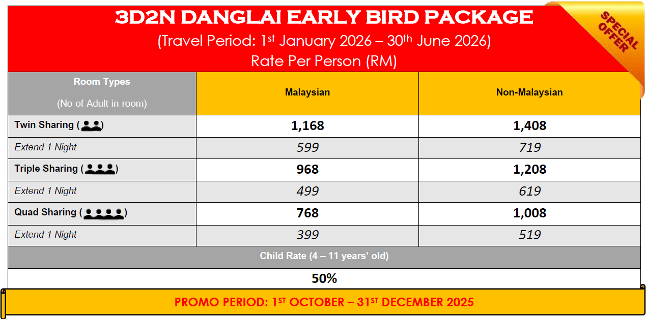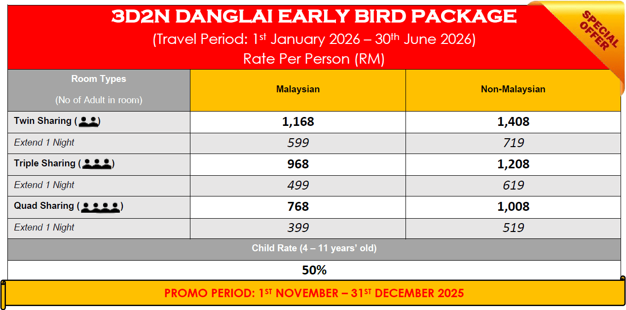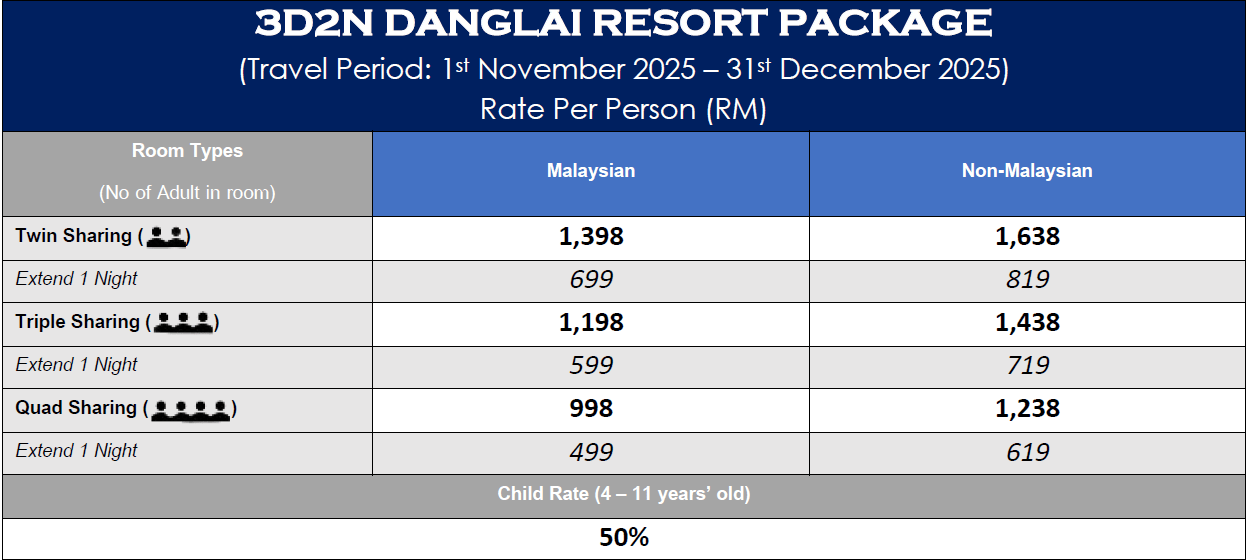 • Extension night includes with 1-night accommodation, 1 x Breakfast, 1 x Lunch, 1 x Tea Break, 1 x Dinner, Complimentary Tea, Coffee, Juice & Water at the restaurant & Complimentary snorkeling at Danglai Resort (Exclude equipment)