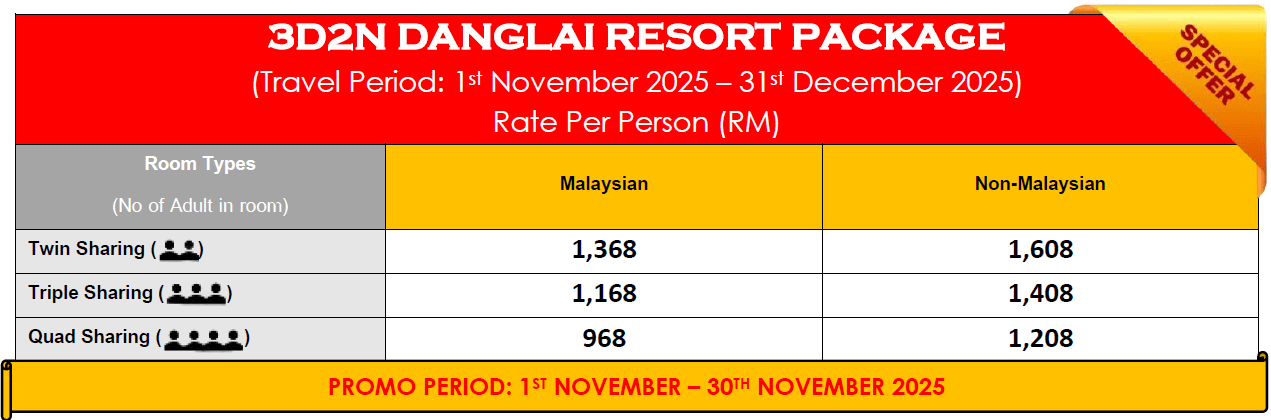 • Tourism Tax for Non-Malaysian (Pay at Resort) – RM10/Room/Night