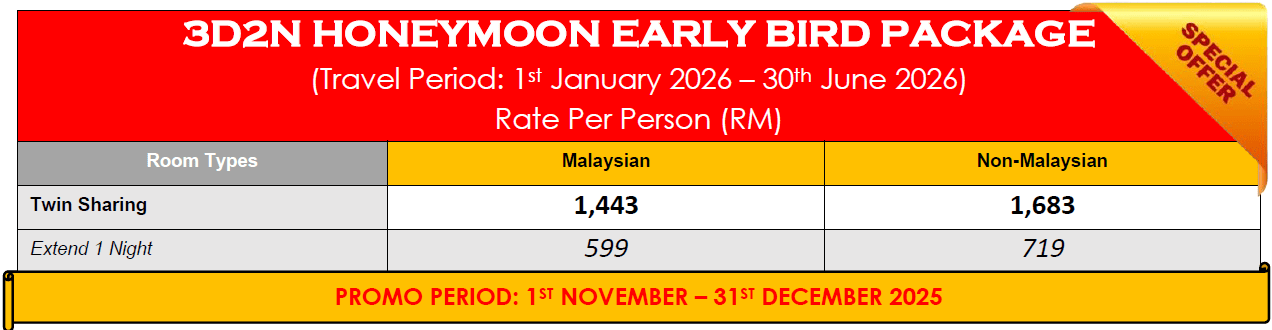 • Tourism Tax for Non-Malaysian (Pay at Resort) – RM10/Room/Night