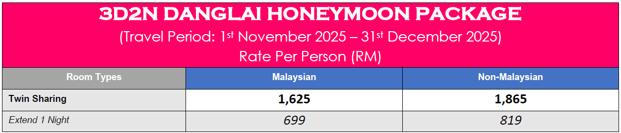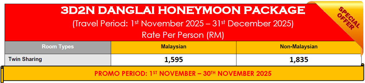 • Extension night includes with 1-night accommodation, 1 x Breakfast, 1 x Lunch, 1 x Tea Break, 1 x Dinner, Complimentary Tea, Coffee, Juice & Water at the restaurant & Complimentary snorkeling at Danglai Resort (Exclude equipment)