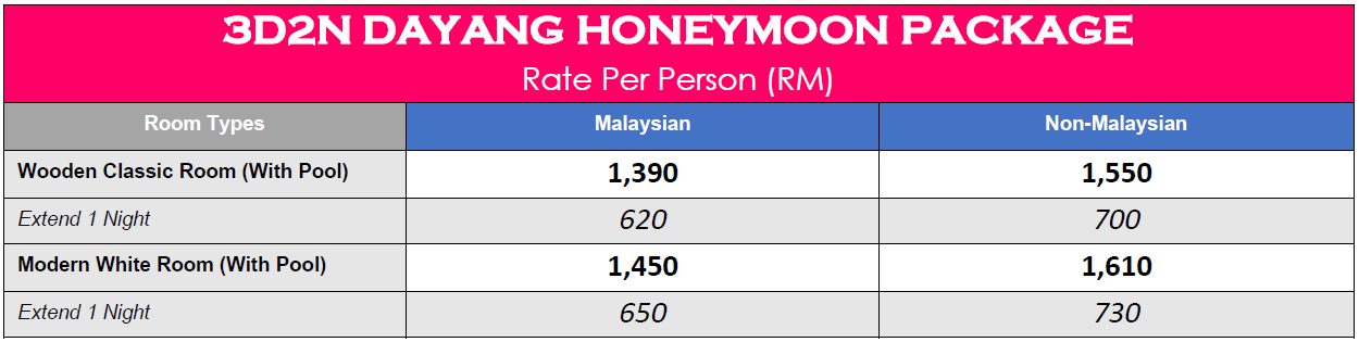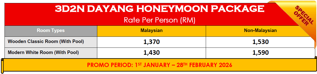 *Exclude pick up & drop at Dayang Resort (RM 150.00/Group)