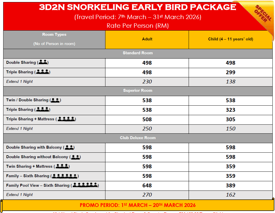 • *Extension night inclusive with 1-night accommodation, 1 x Breakfast, 1 x Lunch, 1 x Tea Break, 1 x Dinner & 2 x Snorkelling Trips (Excluded equipment)