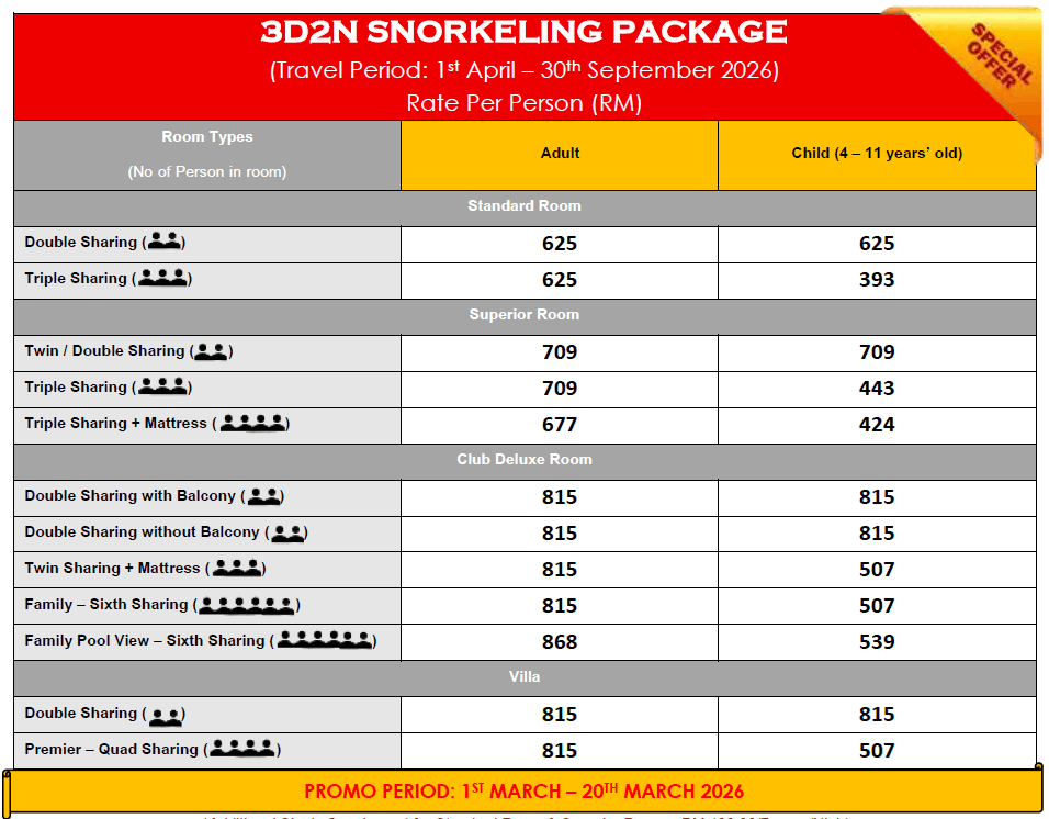 • Each room must consist of minimum 2 adults before child rate apply EXCEPT Club Deluxe Family & Club Deluxe Family Pool View is require minimum 4 adults