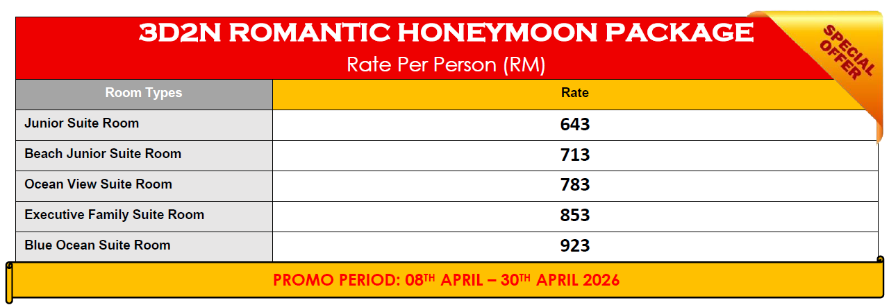 Tempah Sun Beach Resort & Hotel Pulau Tioman honeymoon package bersama PulauMalaysia.com. Kami menawarkan pakej Sun Beach Resort & Hotel Pulau Tioman pada harga terendah di pasaran. Resort ini yang terletak di Kampung Genting merupakan antara resort yang menawarkan pakej bulan madu. Bagi pasangan yang mencari penginapan berdekatan laut, pihak kami mencadangkan supaya anda memilih penginapan di Ocean View Suite kerana unitnya paling dekat dengan laut dan mempunyai ‘seaview balcony’.