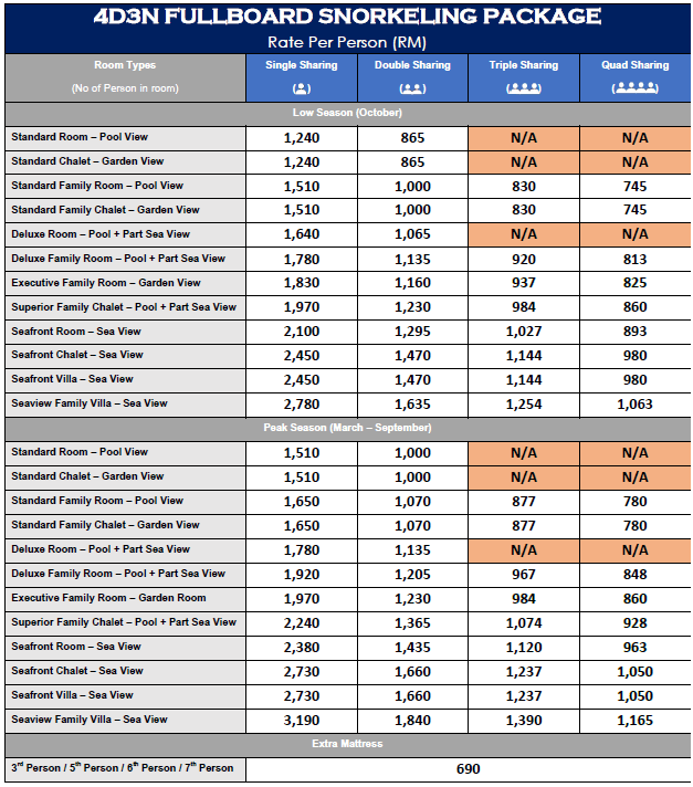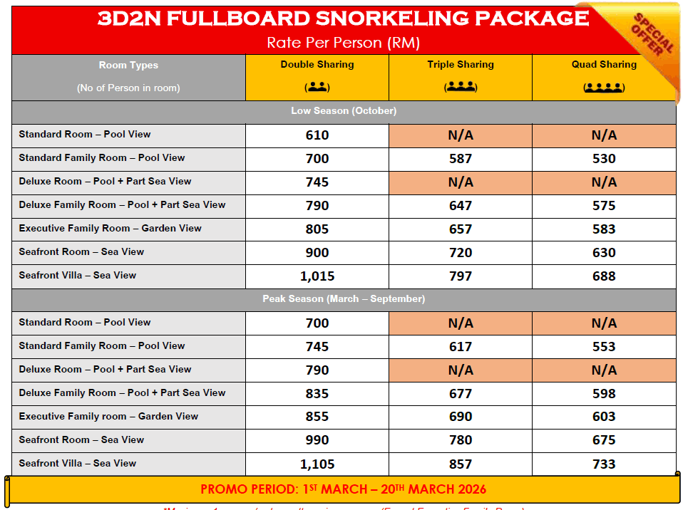 • Optional Snorkeling Trip for children below 6 years’ old (If required) – RM 120.00/Person