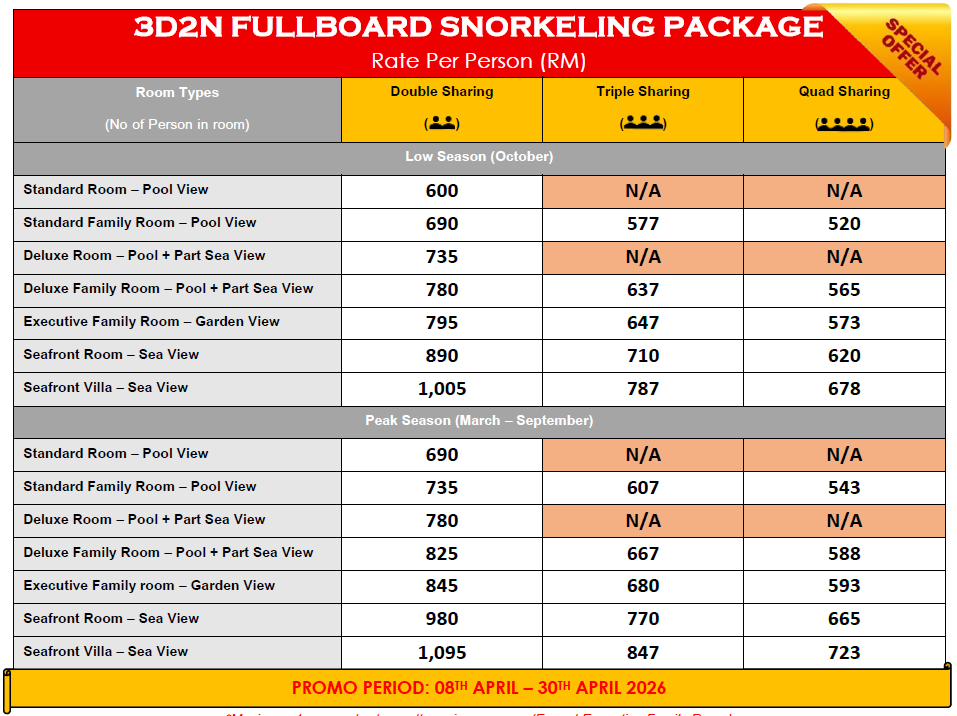 • Optional Snorkeling Trip for children below 6 years’ old (If required) – RM 120.00/Person